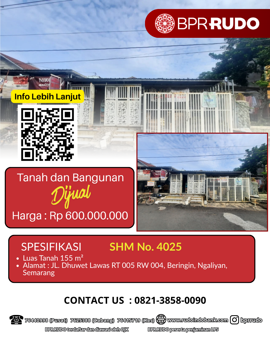 SHM No.4025, dengan Luas Tanah 155 M2, yang terletak di Jalan Dhuwet Lawas RT 005 RW 004, Beringin, Ngaliyan, Semarang