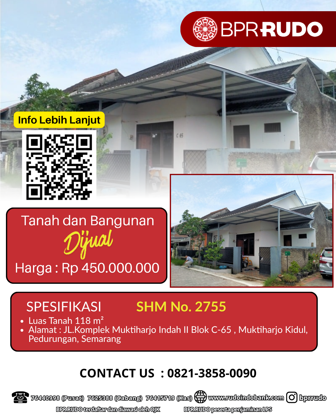 SHM No.2755, dengan Luas Tanah 118 M2, yang terletak di JL.Komplek Muktiharjo Indah II Blok C-65 , Muktiharjo Kidul, Pedurungan, Semarang