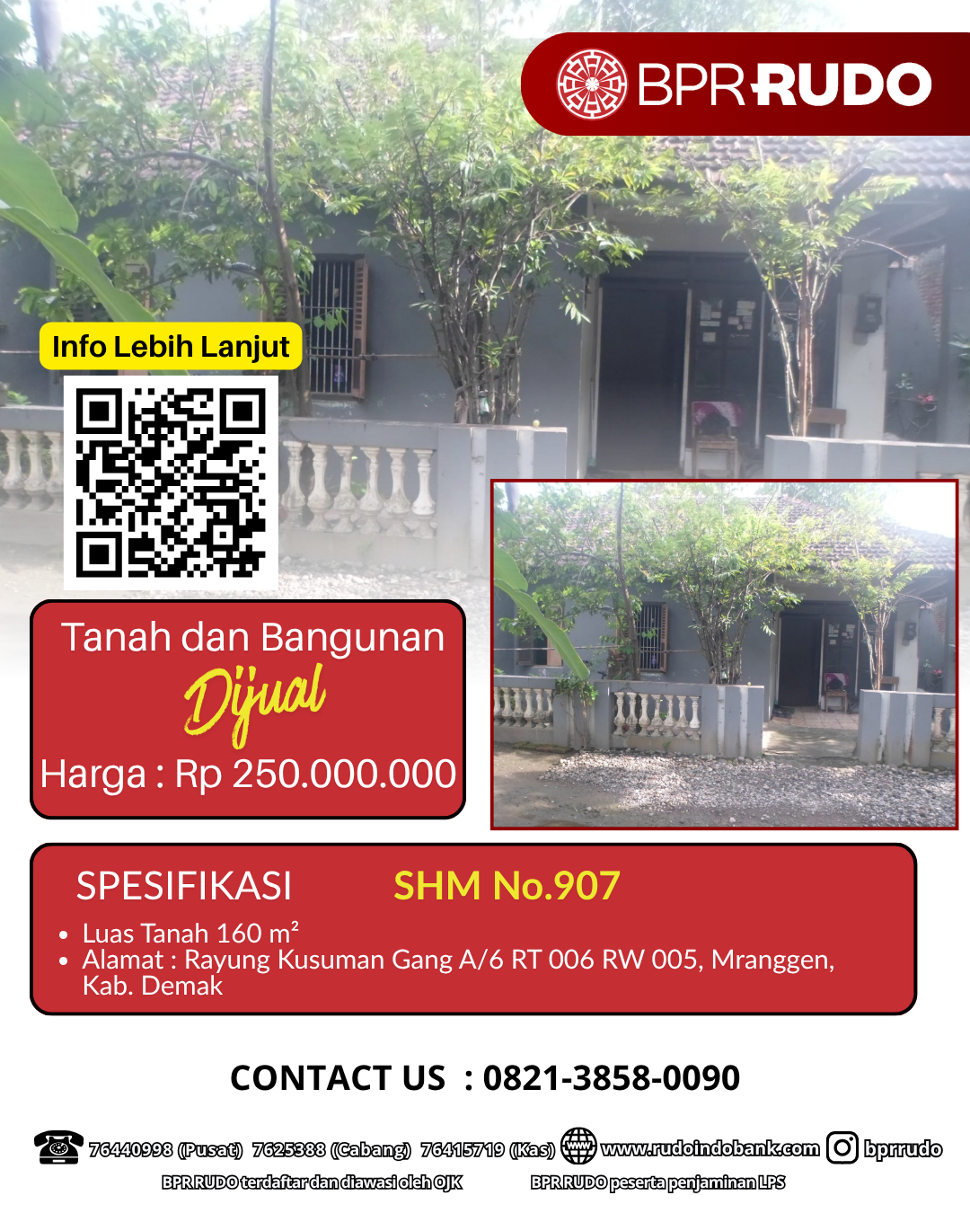SHM 907, dengan Luas Tanah 160 M2, yang terletak di Rayung Kusuman Gang A/6 RT 006 RW 005, Mranggen, Kab.Demak