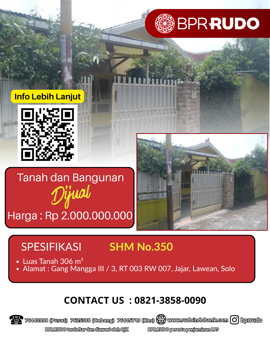 SHM No.350, dengan Luas Tanah 306 M2, yang terletak di Gang Mangga III / 3, RT 003 RW 007, Jajar, Lawean, Solo