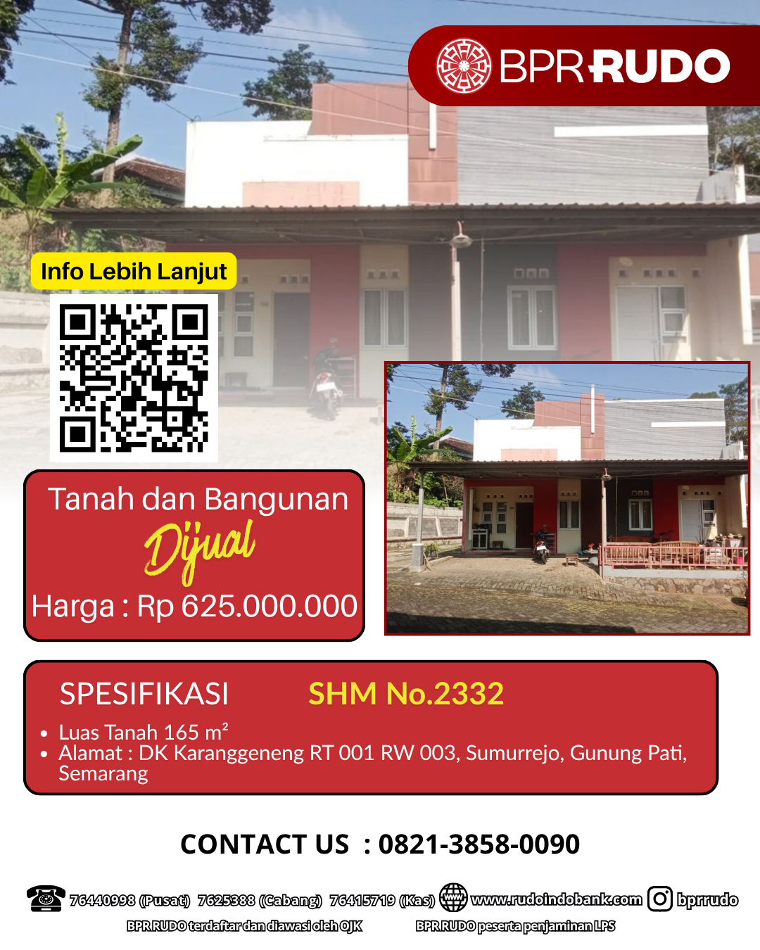 SHM No.2332, dengan Luas Tanah 165 M2, yang terletak di DK Karanggeneng RT 001 RW 003, Sumurrejo, Gunung Pati, Semarang